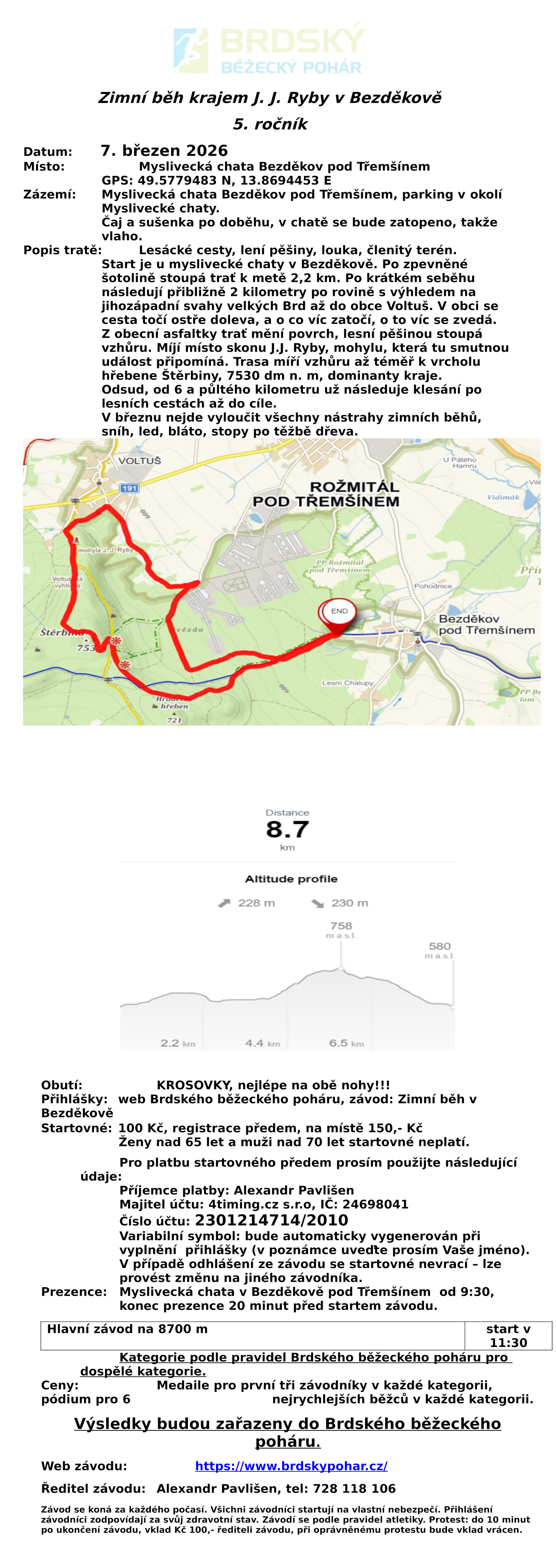 Jaké by to bylo, kdyby letos vyšlo na bezděkovském předjarním závodě počasí jako loni. Počasí ve slunci, na trenýrky, opalovací krémy s faktorem jako na Jadranu... Objednáváme letos stejné, snad na ministerstvu počasí stihnou tlakovou výši a příliv teplého vzduchu zařídit. Máme tam známý, tak snad to vyjde. V každém případě, každý závod tím, že přežije pět ročníků, vstupuje do čekárny pro tradiční akce, jako jsou Velikonoce, Vánoce a minimálně 1. máj. Těšíme se na to, označíme trasu, zatopíme v myslivecké chatě, navaříme čaj, připravíme jelení čepičku, oprášíme bednu pro vítěze a nablýskáme medaile. Podvědomě radši počítáme i s variantou, že na ministerstvu počasí to neklapne. 7. března pro jistotu čepice, rukavice, šály a nákrčníky, neprofoukavé bundy a dvoje ponožky zabalte do tašky. Do auta se určitě vejdou.