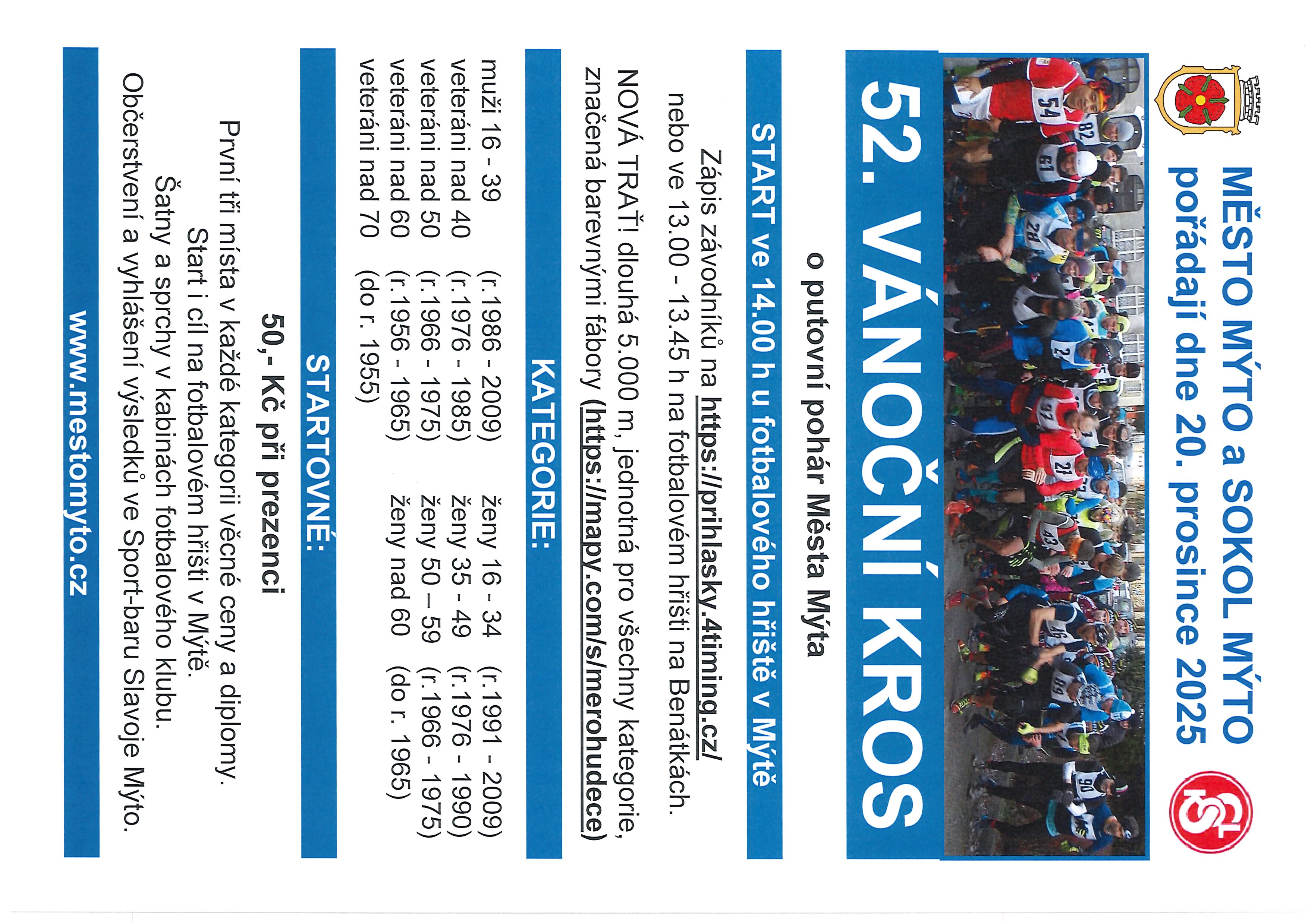Změna trasy Vánoční kros v Mýtě konaný 20.12.2025 startuje i končí poprvé v místě prezence jako loni, nikoliv u kostela. Trasa závodu bude zcela jiná. Po hlavní silnici se již nikdy nepoběží. přihlášky, plakát
